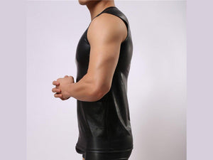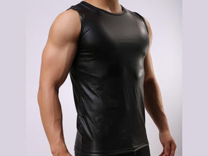 Make a statement on the dance floor with this fabulous faux leather Gay Clubwear t-shirt! This sassy sleeveless style is all the rage, giving you an edgy look that'll make the other ravers swoon. Perfect for any party, this T-Shirt is sure to have you feeling fierce!